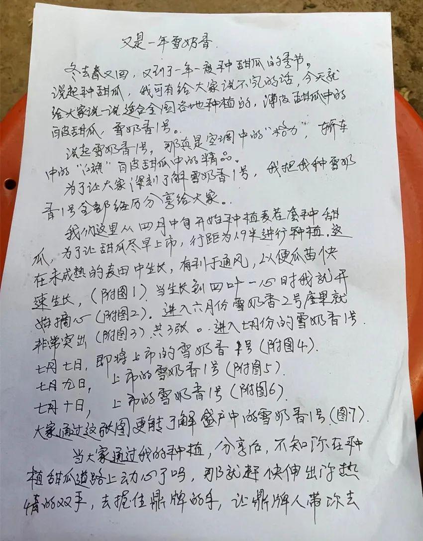 李老板是一位很務實、很勤奮的人,去年和今年都在麥田套栽了甜瓜,效益不錯。今年參加了鼎牌公司的“拍拍獎”活動,看他認真書寫的稿件就讓人敬佩。