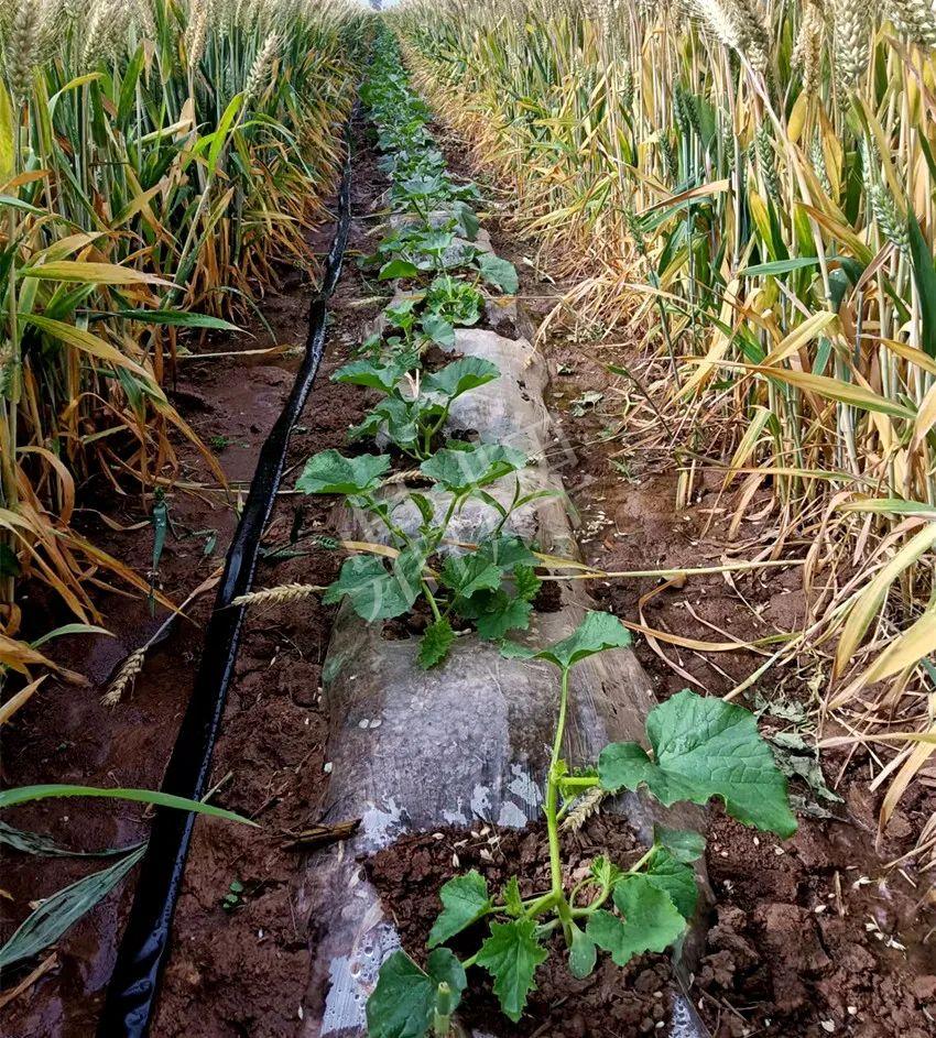 我們這里是從四月中旬開始麥茬套種甜瓜,為了讓甜瓜盡早上市,賣上好價錢,就在麥子收獲前定植。行距為1.9米、株距1米,甜瓜苗在未成熟的麥田中生長,寬行距有利于通風,以利瓜苗快速生長。