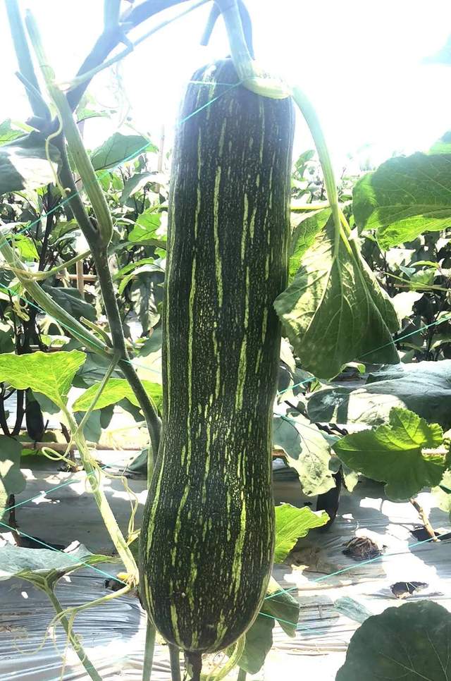 上面的圖片中,有一個(gè)新品種“胖墩”蜜本南瓜,是第一次與成都客戶見(jiàn)面。坐果之齊整,果形之端正,讓參觀的客戶留下了深刻印象;其品質(zhì)與“健美蜜本”南瓜一樣優(yōu)秀,生瓜都好吃!雖然胖、雖然墩,長(zhǎng)得胖胖墩墩,但瓜的空腔小,同樣沒(méi)有“大肚子”。遺憾的是,會(huì)議期間還沒(méi)有成熟,未能品嘗。該品種將于今年10月1日開(kāi)始向全國(guó)推廣。