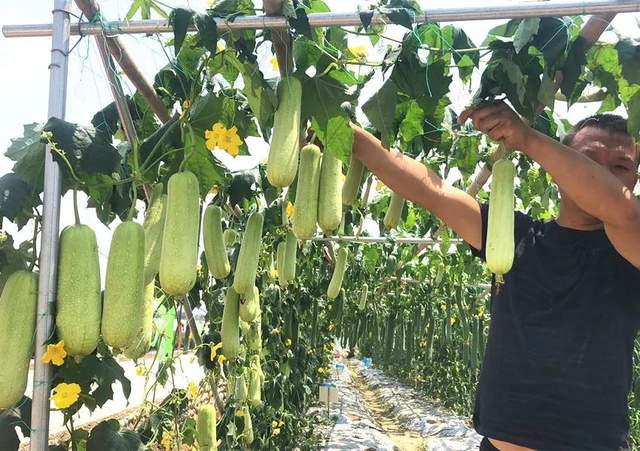 ▲ 客戶在展示“三比6號(hào)”絲瓜,